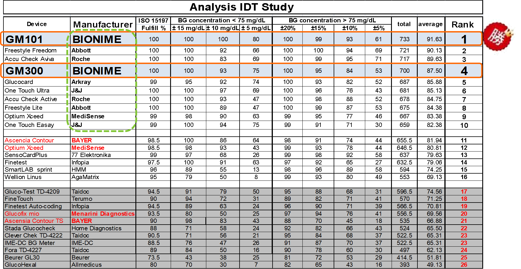 在測(cè)量精準(zhǔn)度方面,瑞特家用血糖儀的表現(xiàn)一直非常優(yōu)秀,德國(guó)第三機(jī)構(gòu)IDT曾抽測(cè)了市面上在售的27款血糖儀,其中不乏ROCHE、JJ、 ABBOTT、BAYER、AKRAY等血糖業(yè)界全球大廠,華廣生技公司生產(chǎn)的瑞特血糖儀在臨床測(cè)試評(píng)比中準(zhǔn)確度力壓全球五大廠獲得第一名。