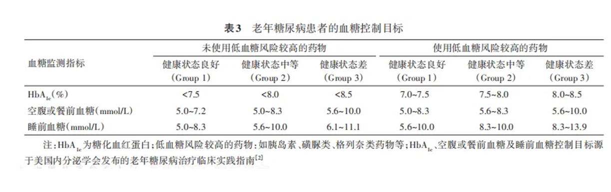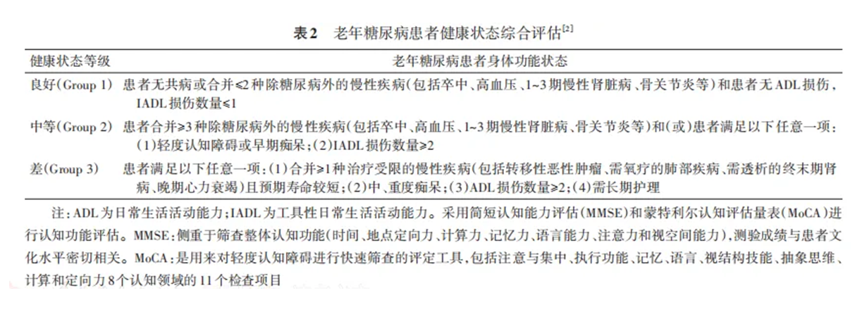 老年糖尿病患者健康狀態(tài)個(gè)體差異很大,常伴有不同程度的認(rèn)知功能障礙及復(fù)雜的基礎(chǔ)疾病,對(duì)老年糖尿病患者的健康狀態(tài)綜合評(píng)估方向,包括共患疾病情況、肝腎功能、用藥情況、日常生活活動(dòng)能力(activities of daily living,ADL)和工具性日常生活活動(dòng)能力(instrumental activities of daily living, IADL)、認(rèn)知功能、精神狀態(tài)、營養(yǎng)情況等多方面,將老年糖尿病患者的健康狀態(tài)等級(jí)分為 “良好(good health,Group 1)”“中等(intermediate health,Group 2)”和“差(poor health,Group 3)”3個(gè)等級(jí)。